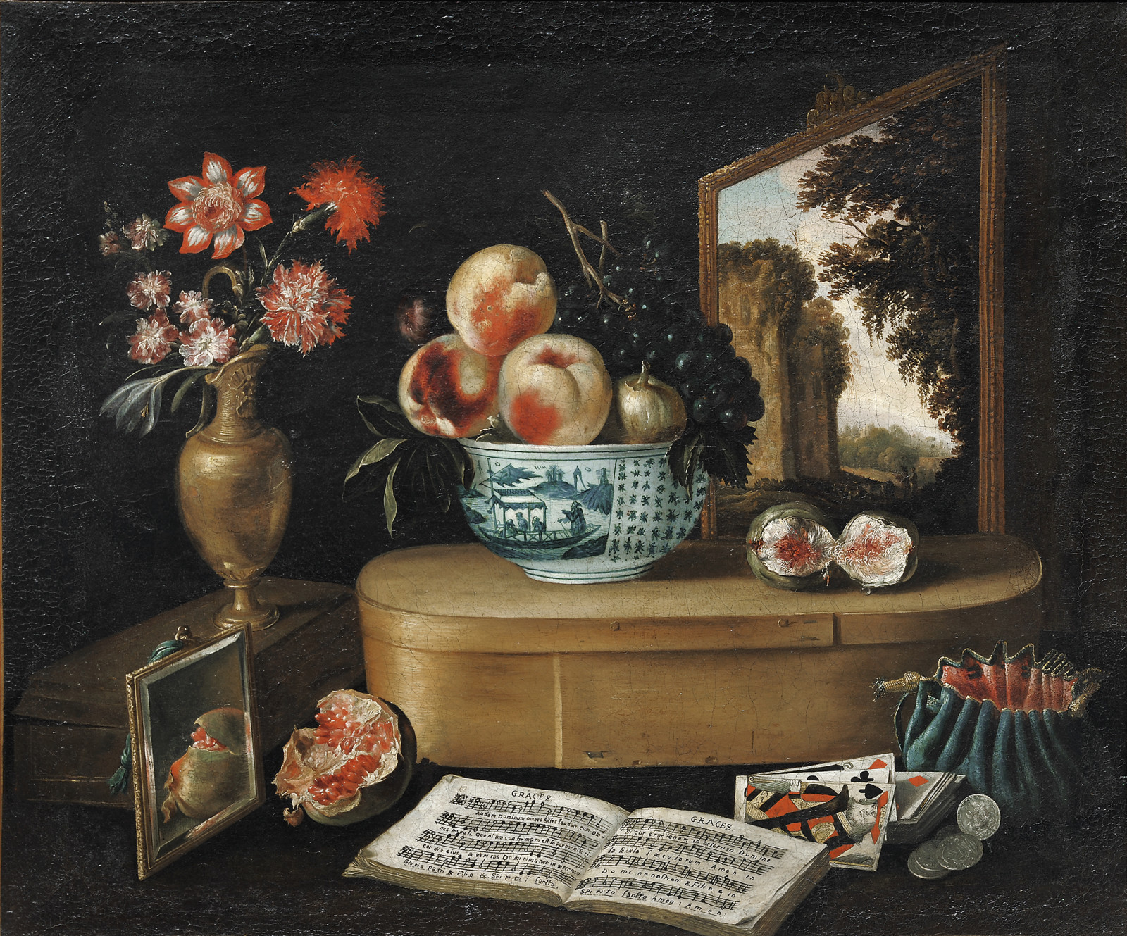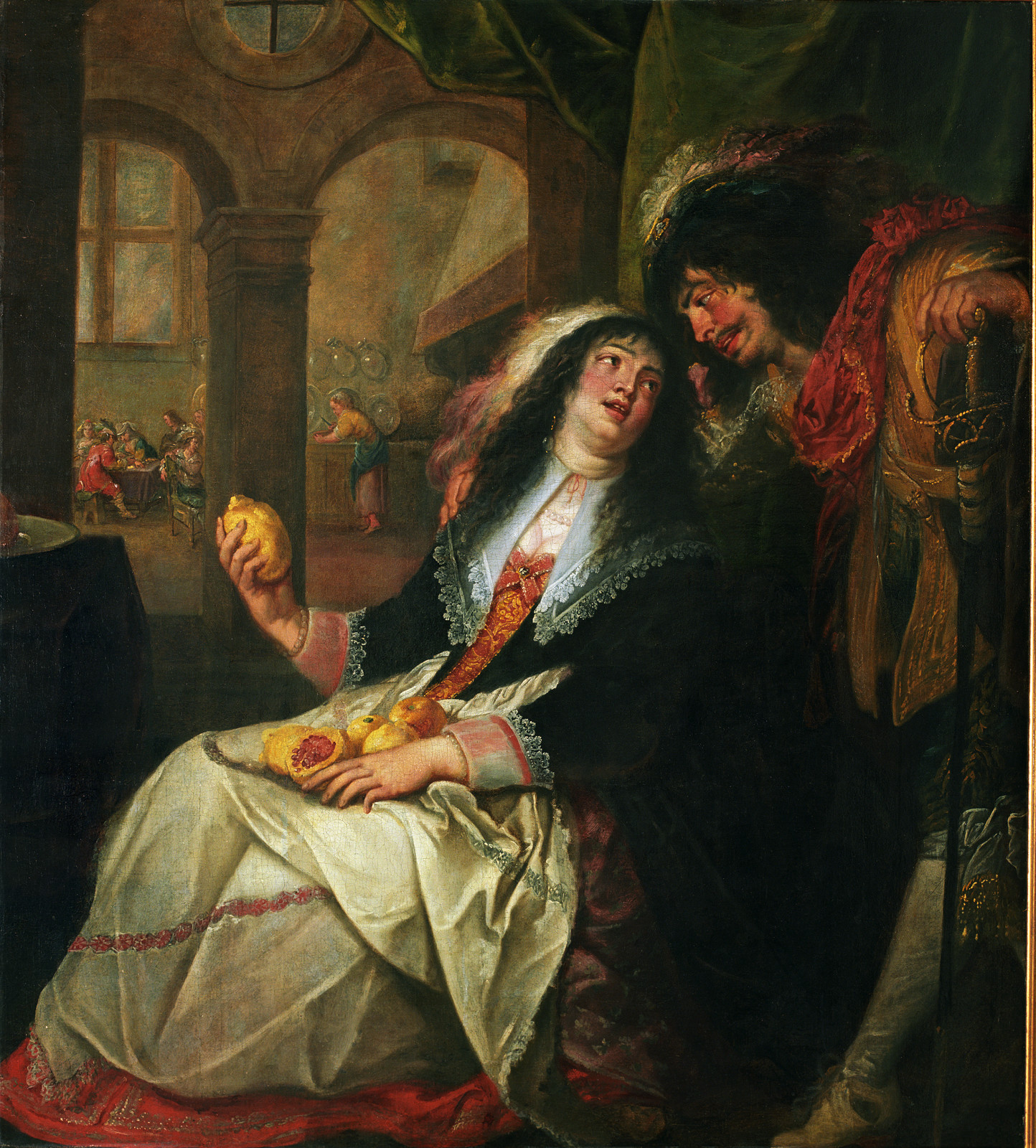 Simon de Vos is known mainly for his genre paintings and portraits. This painting links both strengths. The two main figures dominating the foreground of the composition testify to the ability of the artist as a portraitist. Their positioning, the subtle colours used and most especially the proportions of these figures lend them an impressive presence. The expression on their faces reveals their love and the inclusion of lemons and pomegranates, symbols of faithfulness and passion respectively, is further witness to the nature of their relationship. The moral ‘ after - taste ’ of the lemon, to which 17th-century healing practices attributed a tempering influence, is a summons to enjoy things in moderation. At the same time, the contrast between their alluring, golden exterior and sour interior expresses a warning against being deceived by what one sees and against the bitter - sweet aspects of love. In the context of the senses, the allegories of touch, sight, taste and smell are entwined here with the relationship between man and woman and its erotic connotations.