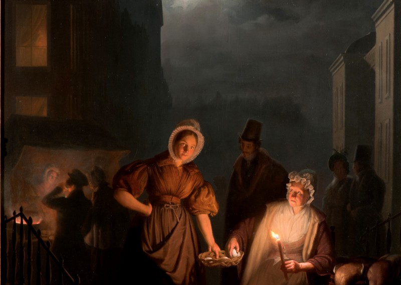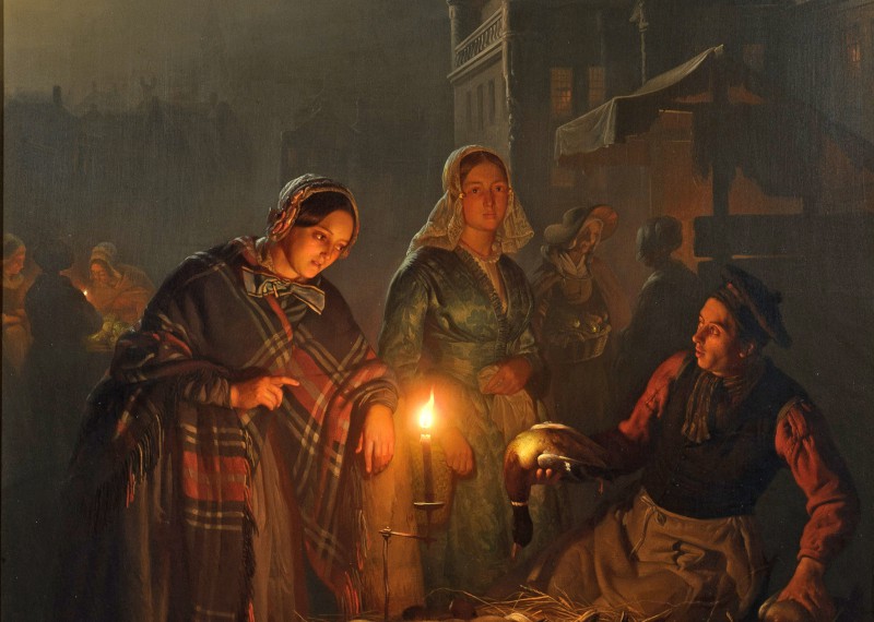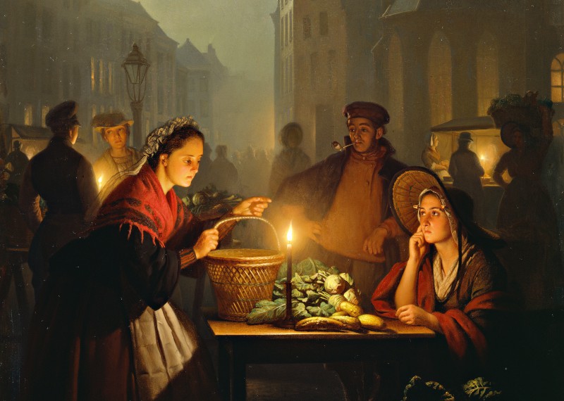 Plus tard viendront s’y ajouter d’autres sources de lumière artificielle et naturelle, telles que les lampes à huile, les feux ouverts, les becs de gaz, les feux de Bengale, l’électricité et le clair de lune. De son vivant, il était le spécialiste des compositions de différents effets de lumière. C’est vers 1830, à Amsterdam, que van Schendel peint son premier tableau représentant un marché à la lumière deschandelles – une invention romantique de l’artiste qui ne correspondait pas à une réalité, mais qui lui valut une très grande réputation tant en Hollande qu’à l’étranger. Vivant dans une situationéconomiquement difficile, il part en 1832 avec sa femme pour Rotterdam où il est engagé comme professeur de dessin. Il y peint beaucoup de portraits sur commande, mais également une large gamme de tableaux qui montraient sa capacité dans le domaine des effets de lumière artificielle. En 1838, après des premières expositions à l’étranger, il s’installe à La Haye où il espérait élargir sa clientèle.